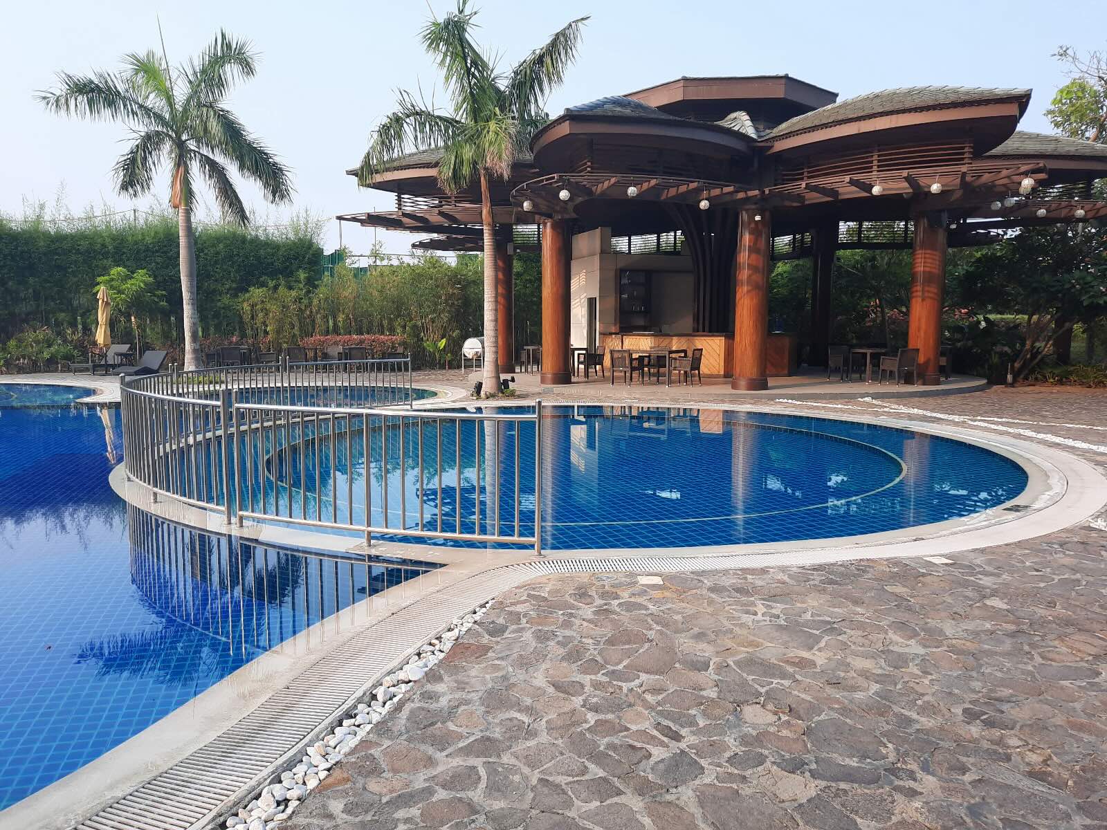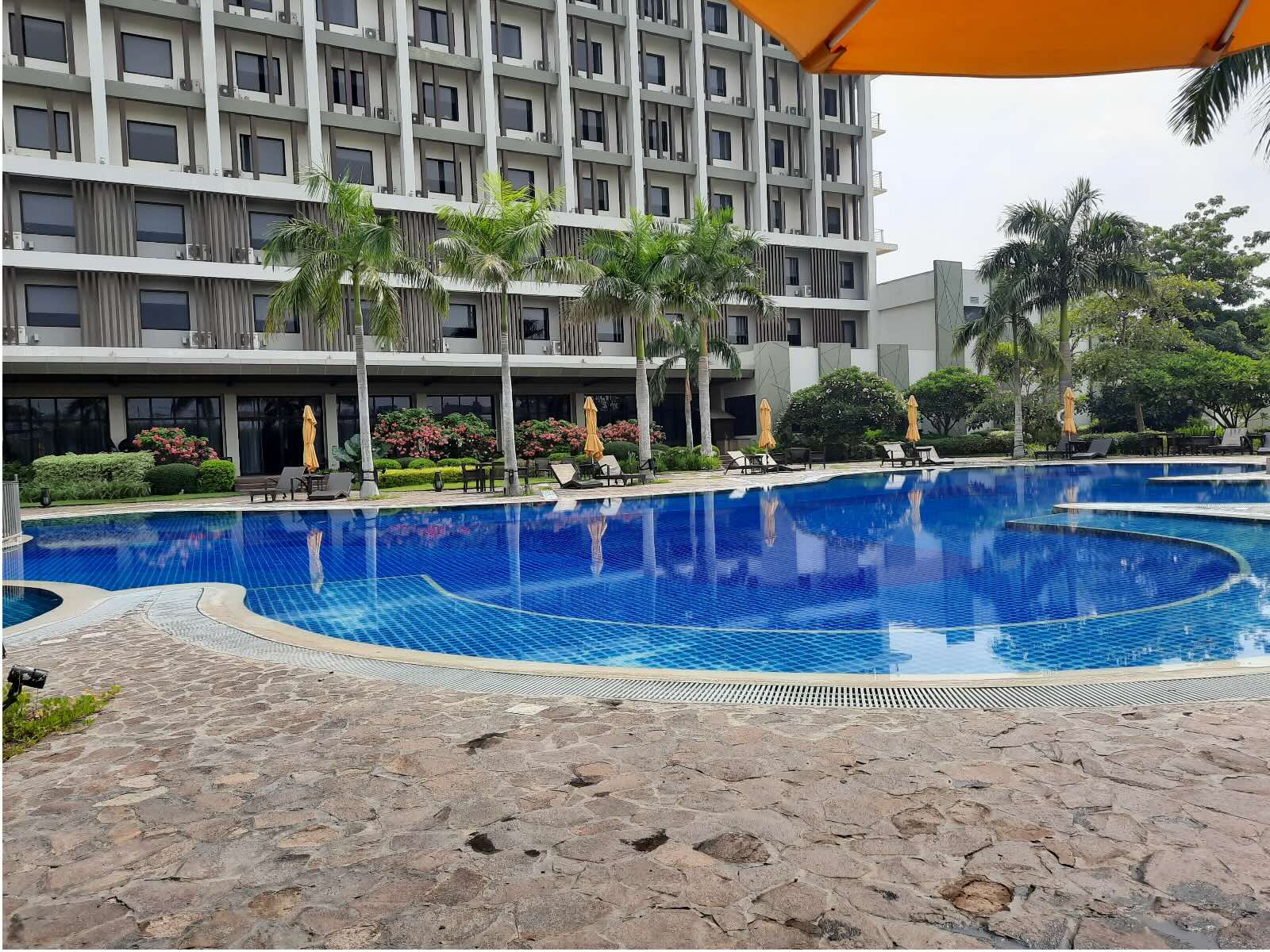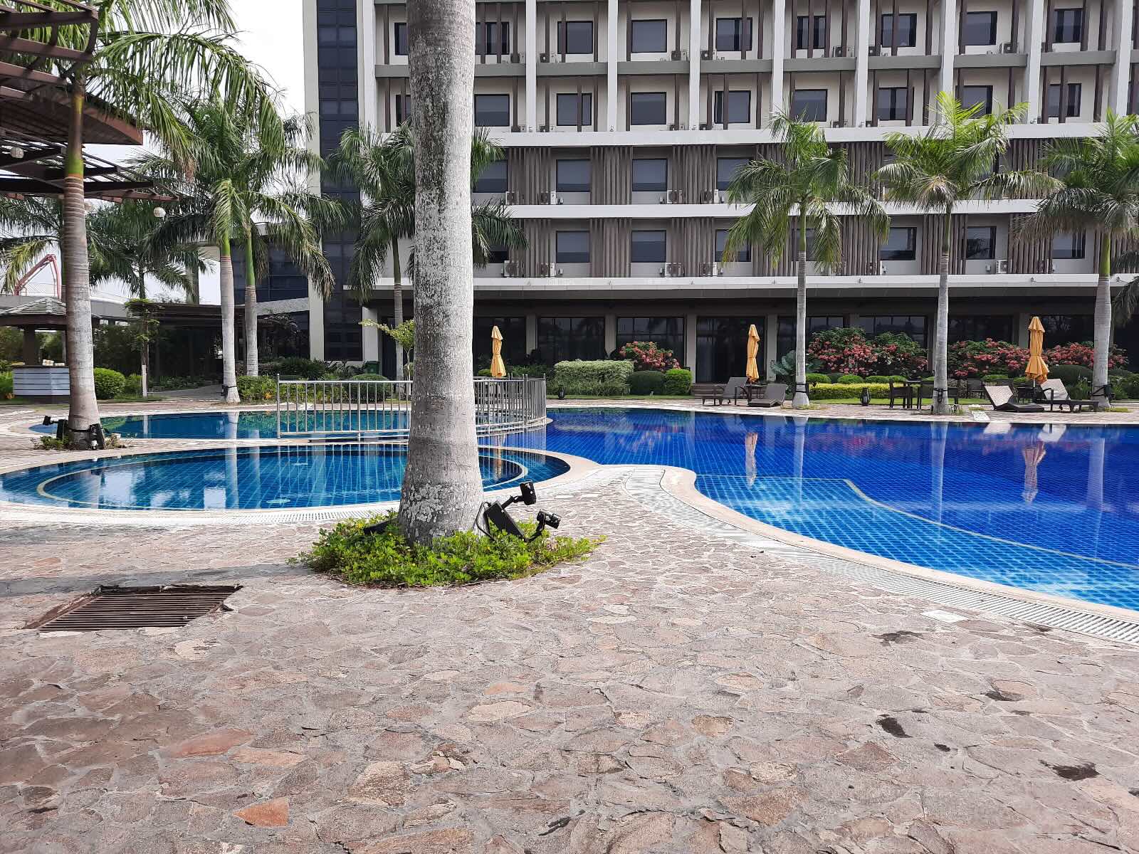 We had a cup of coffee and enjoyed the view to settle in. Once we were a bit rested, we went out for a walk, as there really wasn’t much to do. We went downstairs to stroll the grounds and to check out the outdoor pool. There was a pocket garden towards the pool. There were rooms with a pool view, and their front view was adorned with a wide variety of plants and shrubs. The pool was huge and there were a lot of pool chairs all around, by the edge of the pool.